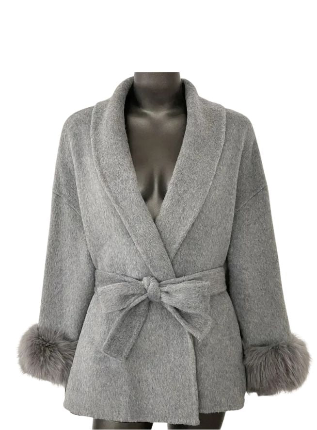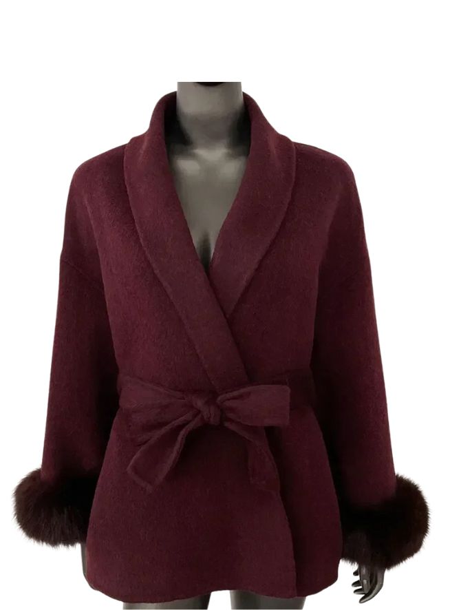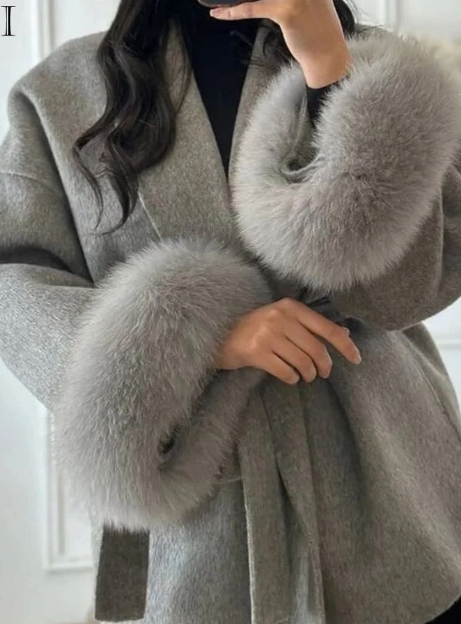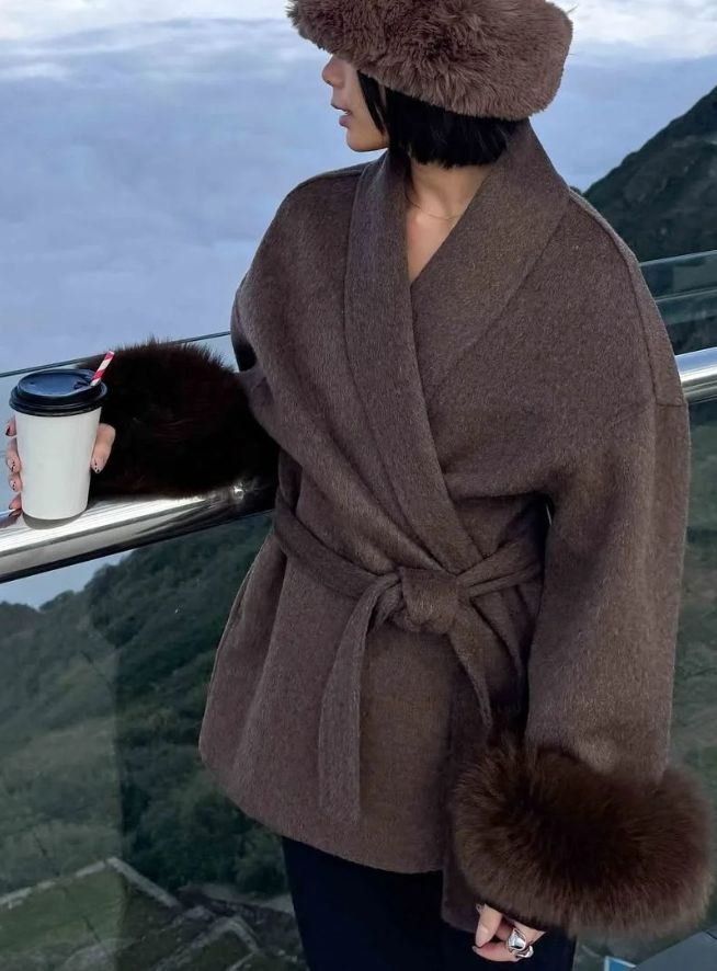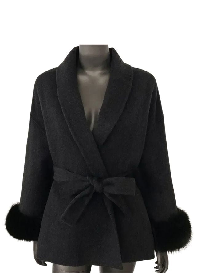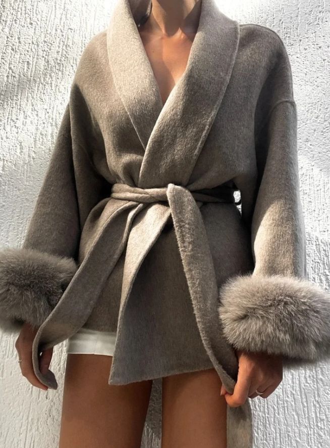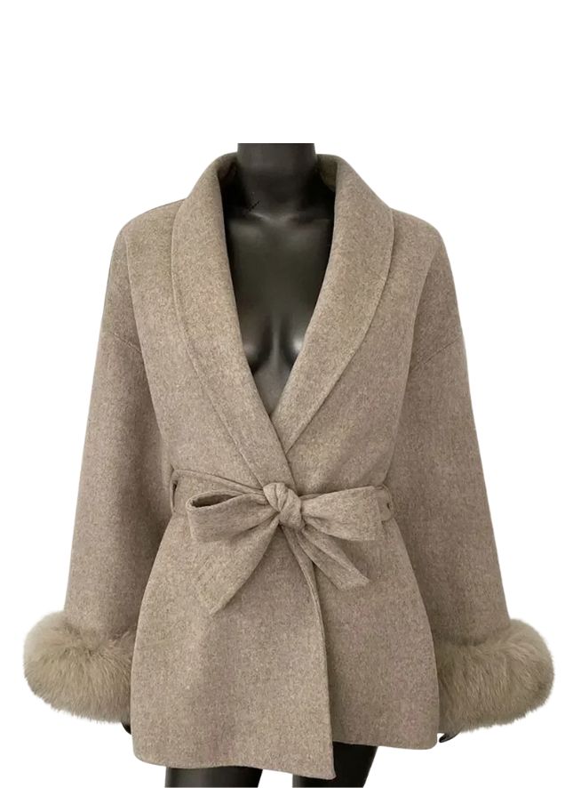 Détails : col drapé, ceinture large, poignets en fourrure.
